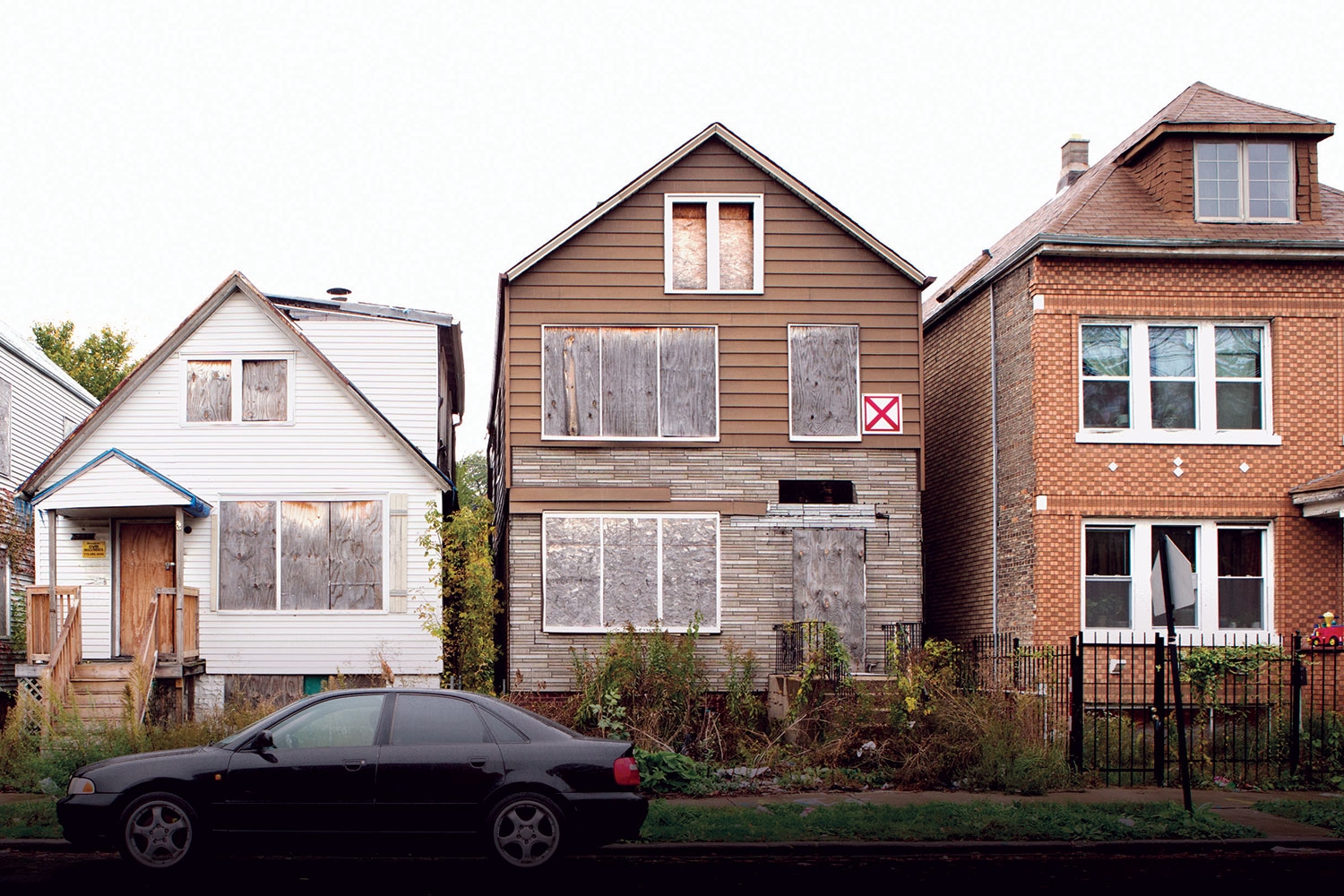 According to a 2014 report by the Chicago Reporter, there are an estimated 18,000 abandoned houses and apartment buildings in Chicago, and at least one in five have been empty since the early days of the foreclosure crisis in 2008 or 2009. Of those 18,000 abandoned buildings, about half are tied one way or another to one of the six big banks doing big business with the city. With the inhabitants long gone, they sit empty and decaying – stripped of copper and fixtures, breeding grounds for vermin, havens for drugs and crime. To their institutional owners, the upkeep isn’t worth the money, so the banks just walk away – leaving them to die — often without following through on the foreclosure process.