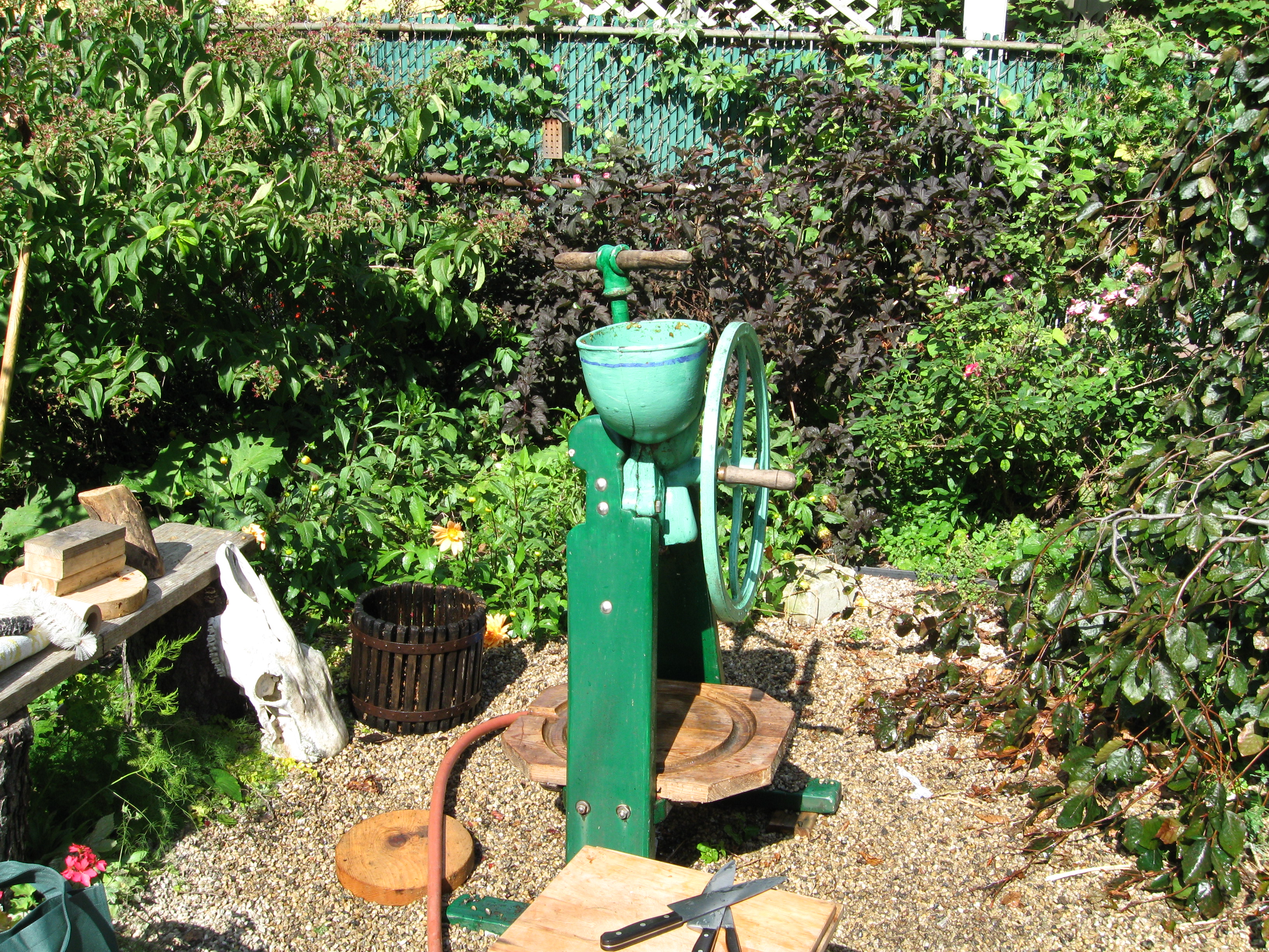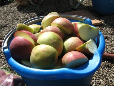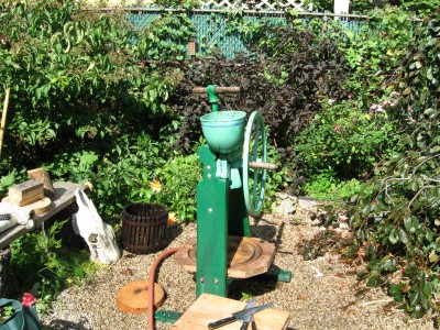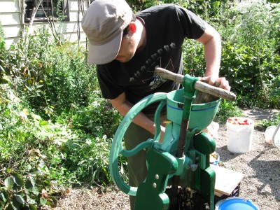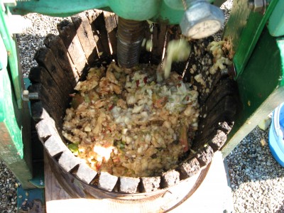 Yesterday my friend JR and I trekked down to N.’s Little Village estate to avail ourselves of her cider press. Five hours and three bushels and change later, we had just under seven gallons of fresh squeezed apple nectar that, hopefully, will in the not-too-distant-future mutate into even more delicious hard cider. If it doesn’t, I guess everyone gets apple cider vinegar for Christmas.