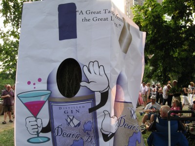 Here Ellison only had a small window of opportunity to get his story out before people lost interest. The night before he’d stayed up till 3 AM making a giant banner for the booth. Inspired by a friend’s observation that, to him, Door County meant cherries, salt water taffy, and ticky-tack tourist traps, he’d created six-foot-tall anthropomorphic bottles of vodka and gin, with cutouts into which people could stick their heads and have their pictures taken. Ellison planned to take snapshots with his iPhone and email them on the spot to the subjects. But taped to two monster pieces of foam core and leaned up against a tree, the sign refused to cooperate. Flapping and accordioning in the stiff breeze it lasted about five minutes.